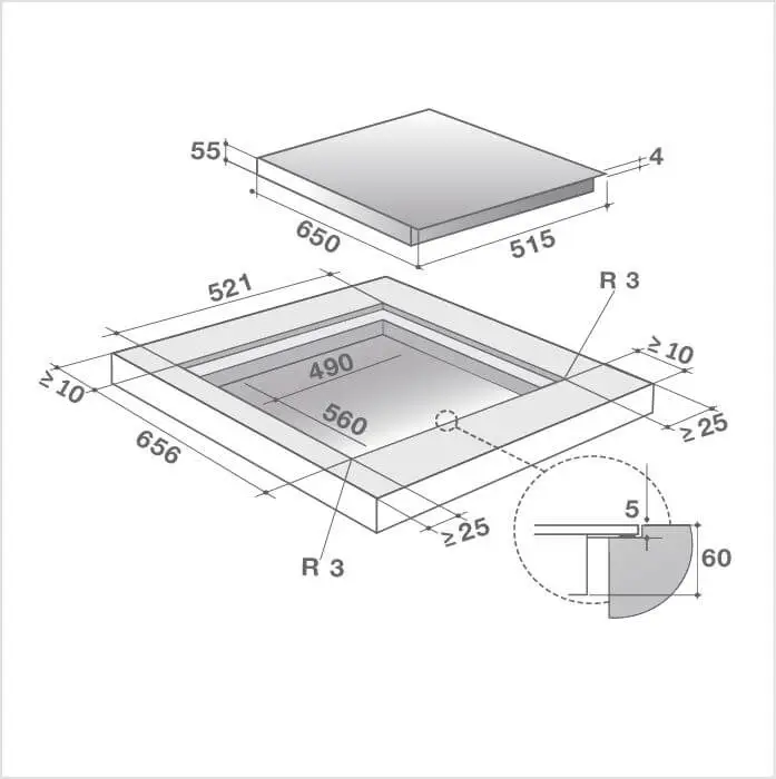 Avec une intensité supportée de 32 A et un câble électrique de 1,3 m (sans fiche), l’installation est conforme aux normes actuelles. Les dimensions d’encastrement sont de 560 x 490 mm, pour un poids net de 11,5 kg.